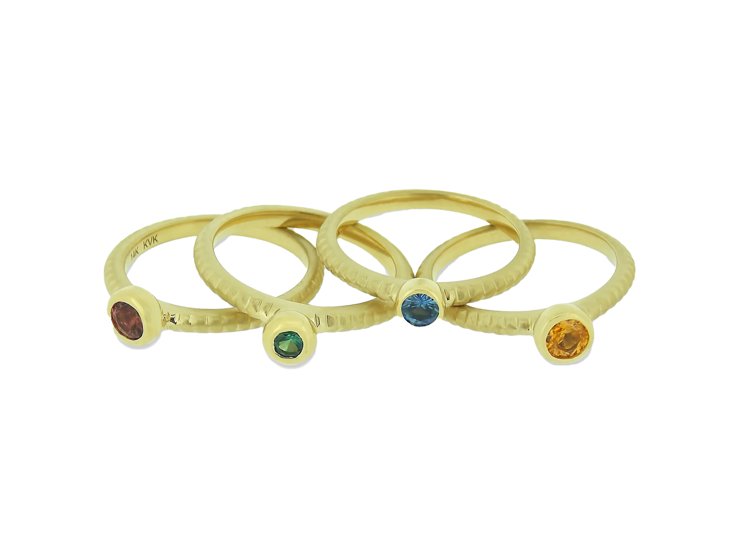 A fabulous new twist on an all time favorite.  This unique stacking band has the birthstones in various sizes, with the bezels slightly off set, so each band nests against each other.  This is a fabulous ring for a stylish Mom!