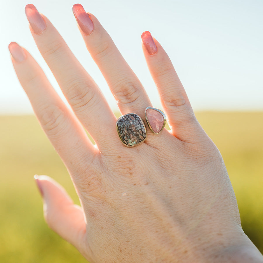 Fossilized Pink Dinosaur & Tourmaline Double Ring