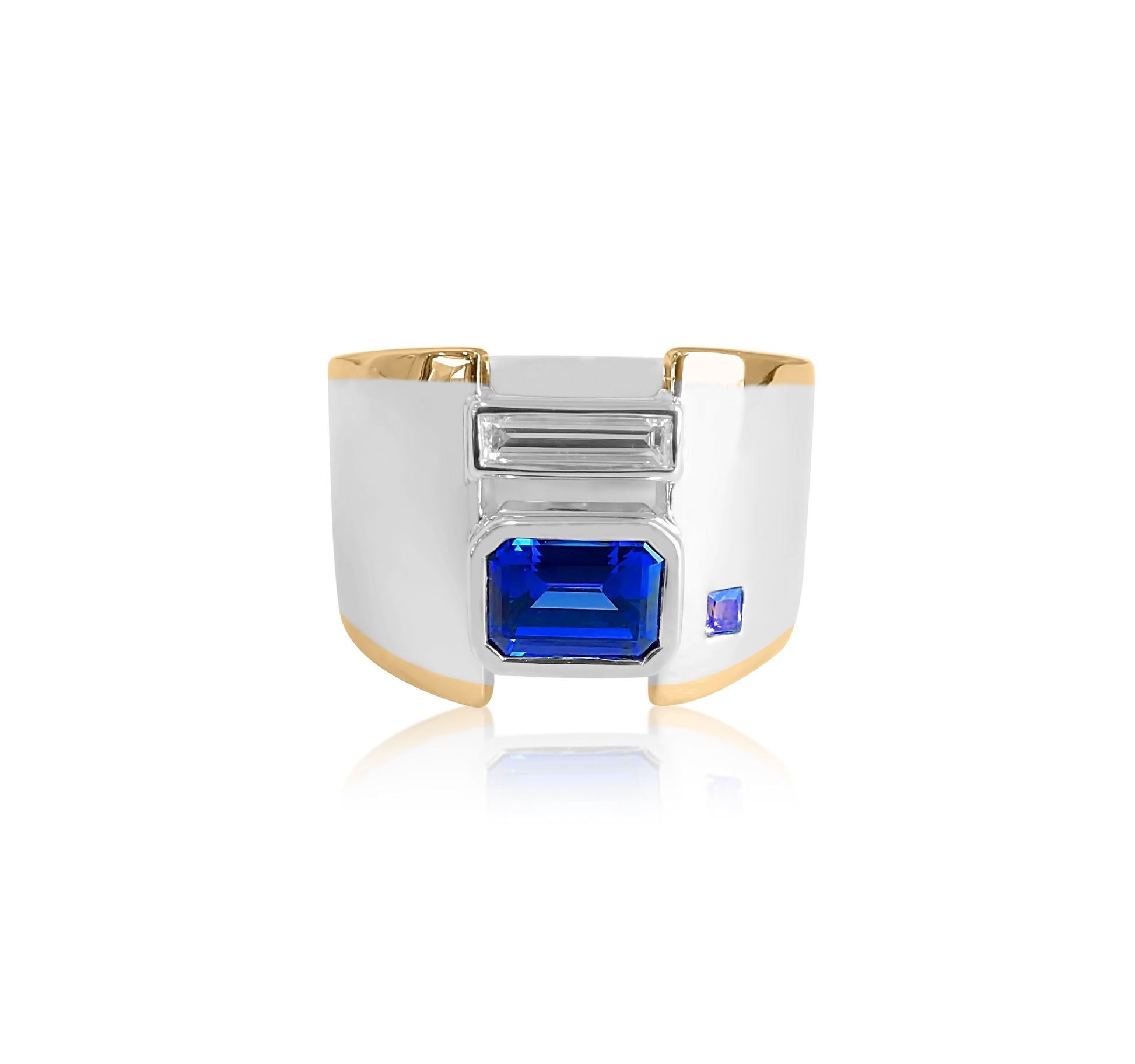 This very special one of a kind ring had her late husband's diamond birthstone custom cut into an elongated baguette, and her sapphire birthstone in an rectangle cut. A nod was given to a brother she loss with the small amethyst stone. It is a combination of white and yellow gold in a hand fabricated bespoke ring.