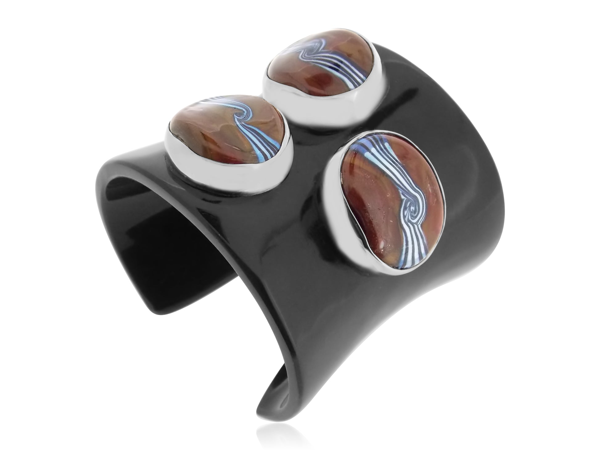 A few of the ashes from a beloved family member were mixed with resin to form unique beads. The beads were set in white gold and riveted onto a buffalo horn cuff. To be worn with love.