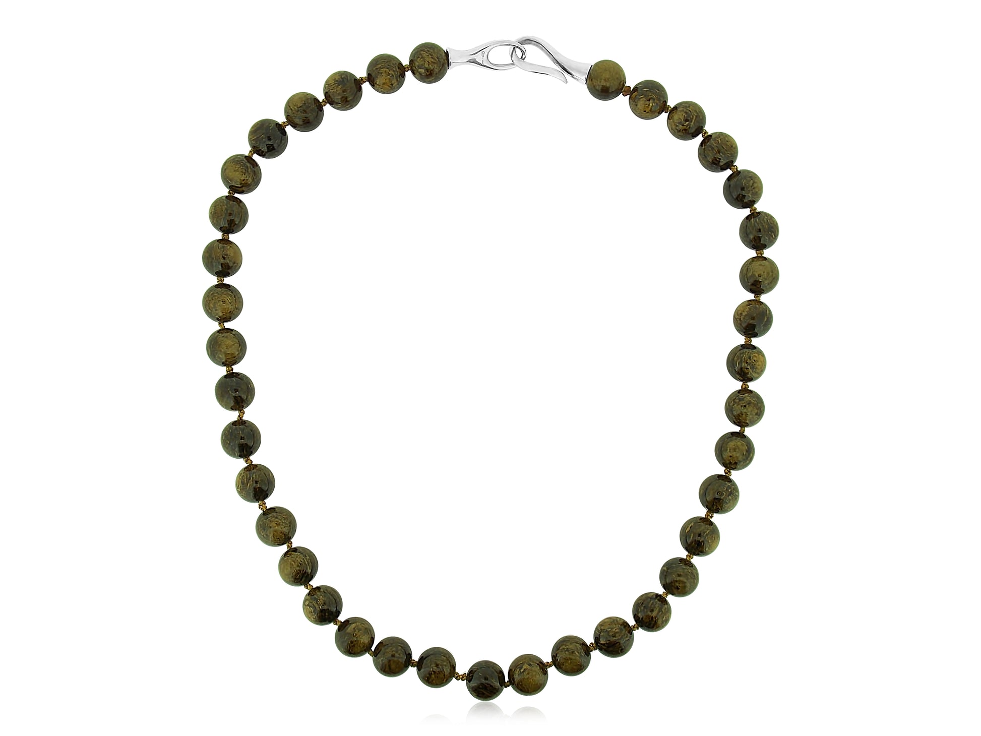 The finest Emperado marble from Spain is cut into beautiful 14mm round beads. The artist knotted the pieces into a 22 inch long necklace. The Italian made sterling silver, easy to use clasp is a beautiful finishing touch!