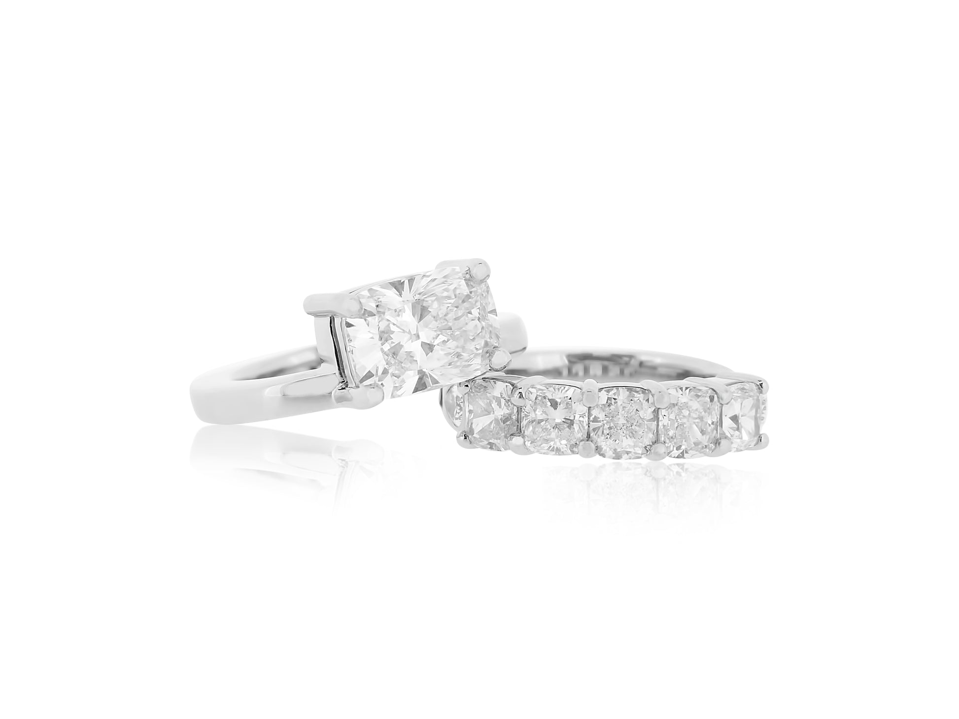 Elongated 3ct cushion diamond ring with square shank in platinum