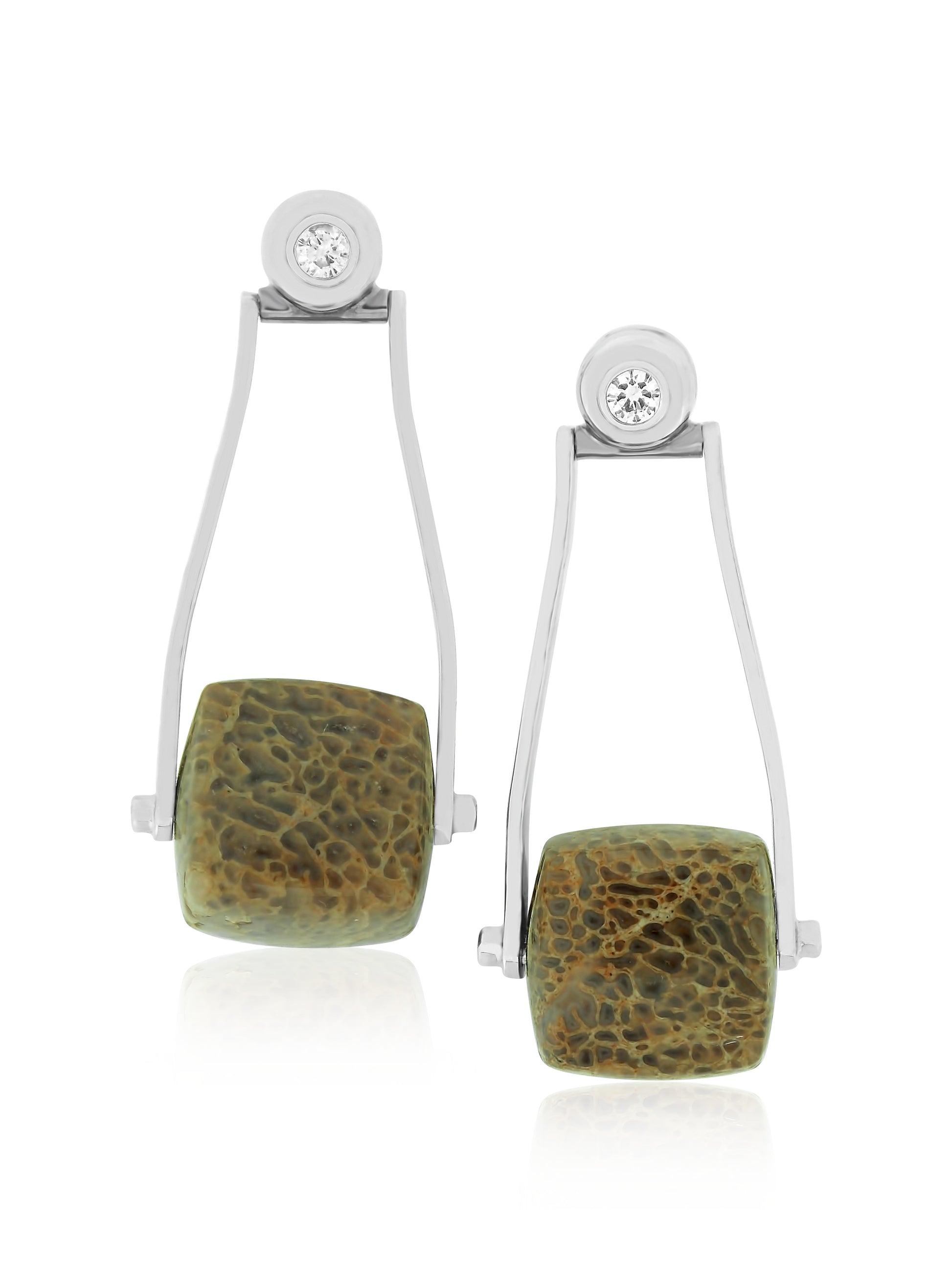 Exotic rare opalized dinosaur bone cube earrings. These 1.5” long earrings are designed for incredible movement with both swinging and spinning motion. This 18kt white gold hand made mounting features a diamond bezel top, hand forged 18kt sides, with bezel diamonds on the sides. Give them a spin you will adore this gorgeous pair of earrings!