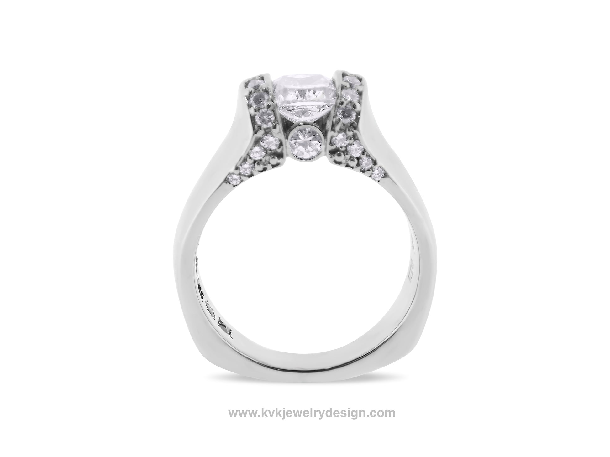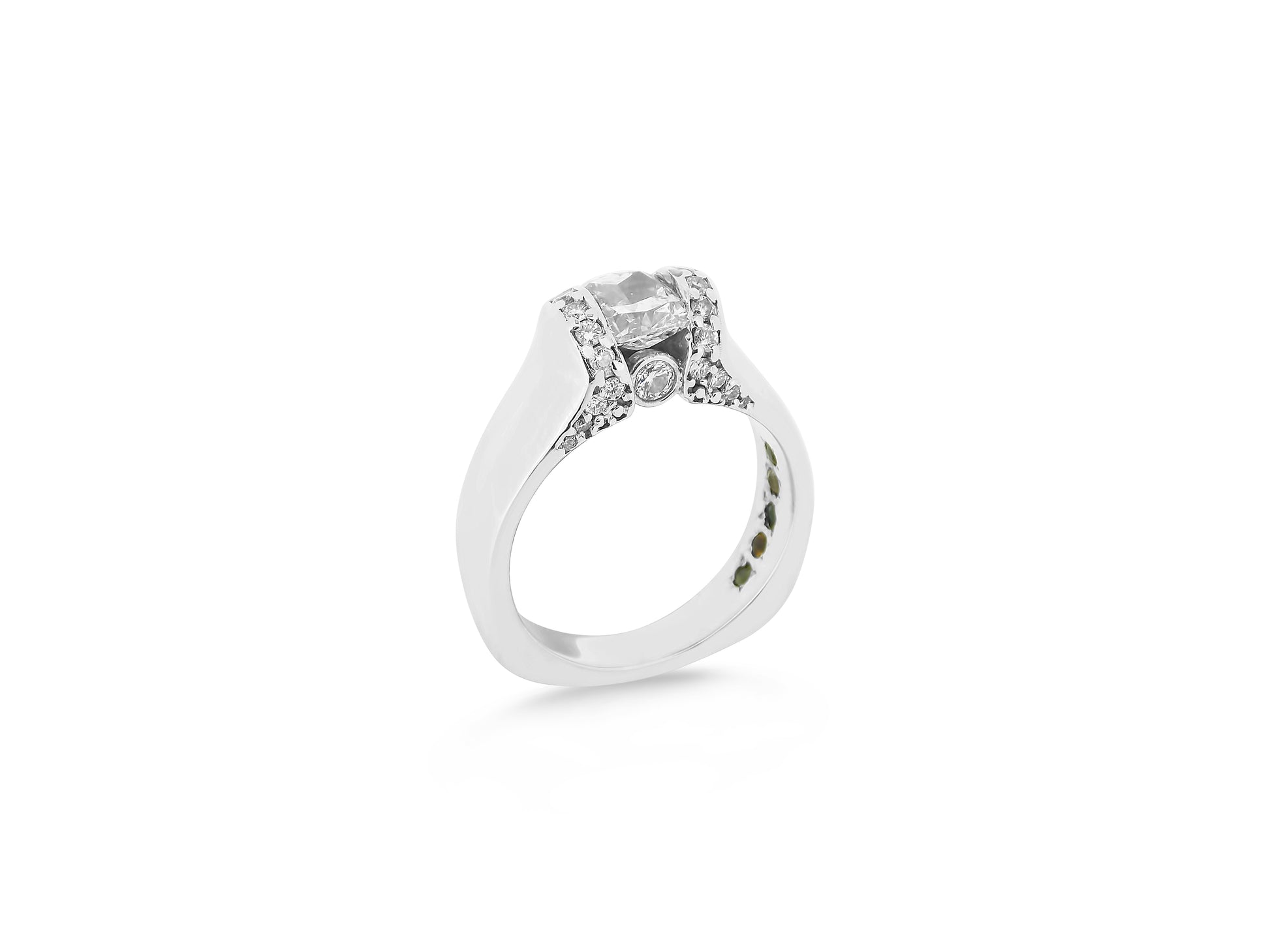 This stunning cushion cut diamond is accented with beautiful round diamonds with a large round at the base. The client had her children, husband and her birthstones flush set inside the band.