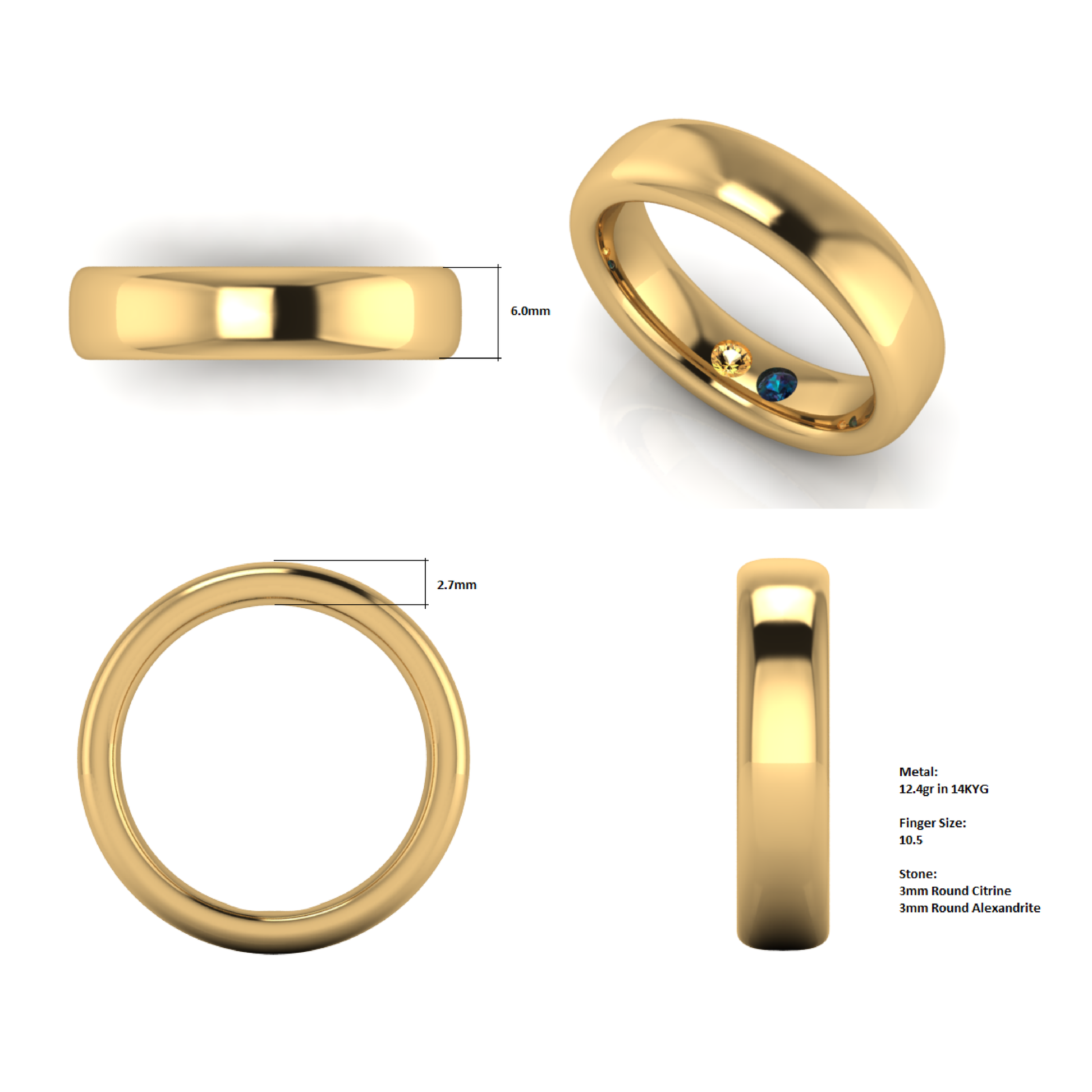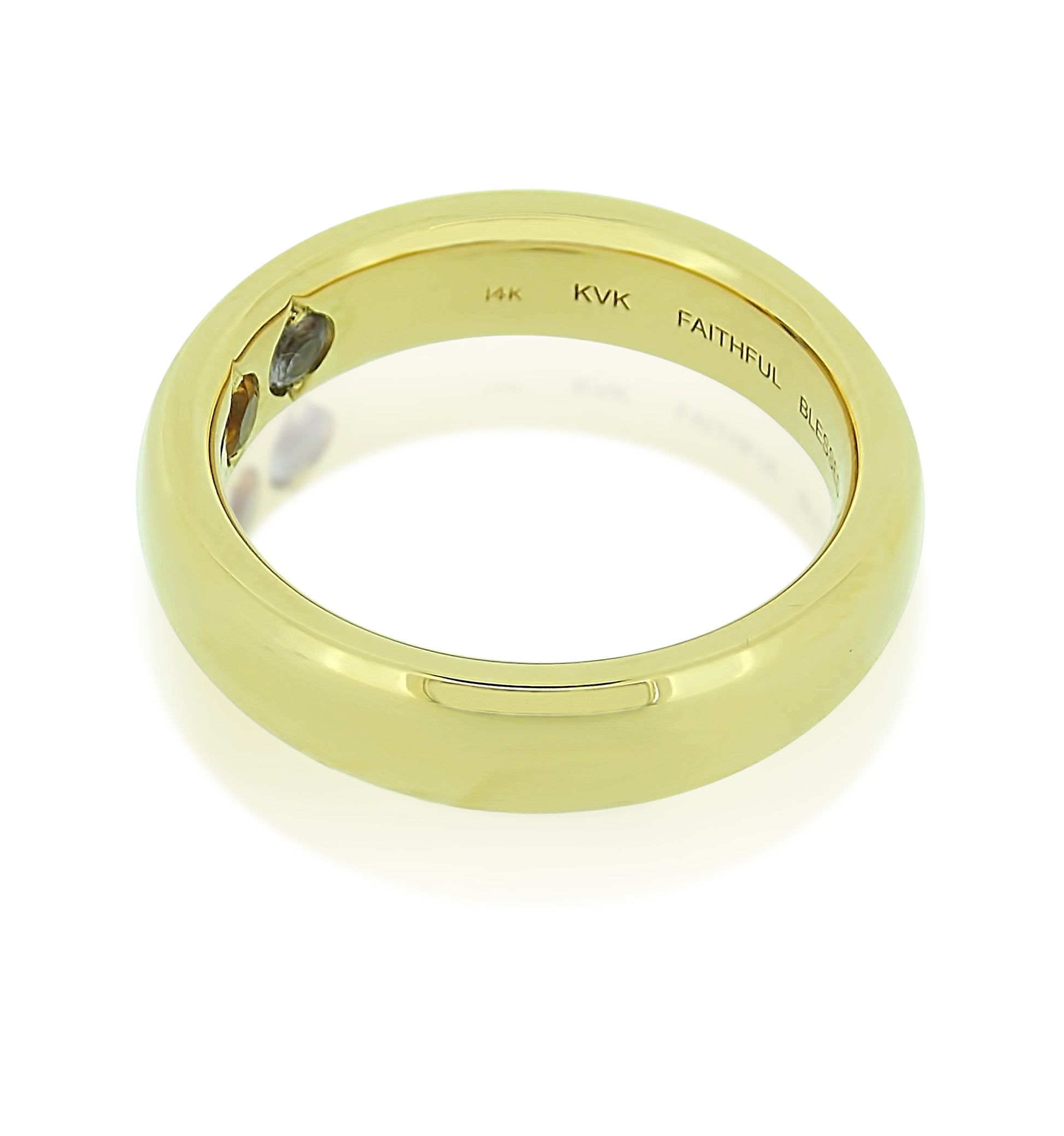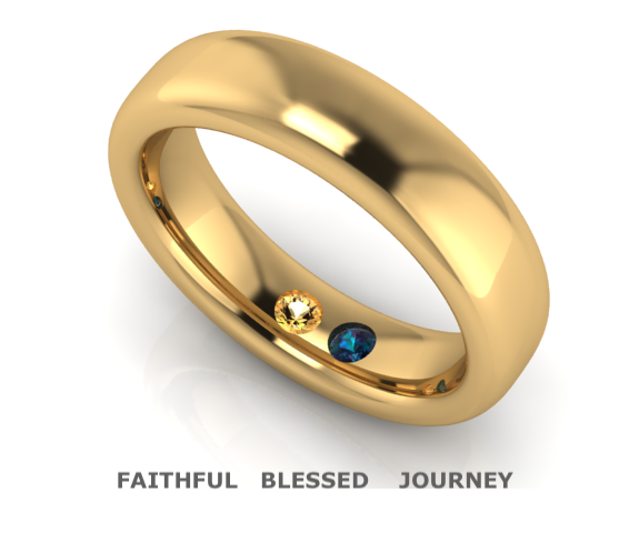 This lovely couple in celebration of their 50th wedding Anniversary the Mrs. had a new custom wedding band made for her husband. The original was worn out and wanted this new band to celebrate this fabulous milestone. In addition to being a hand made, heavy gold band; it was personalized with the birthstones of the couples daughters and engraved with “Faithful Blessed Journey”.