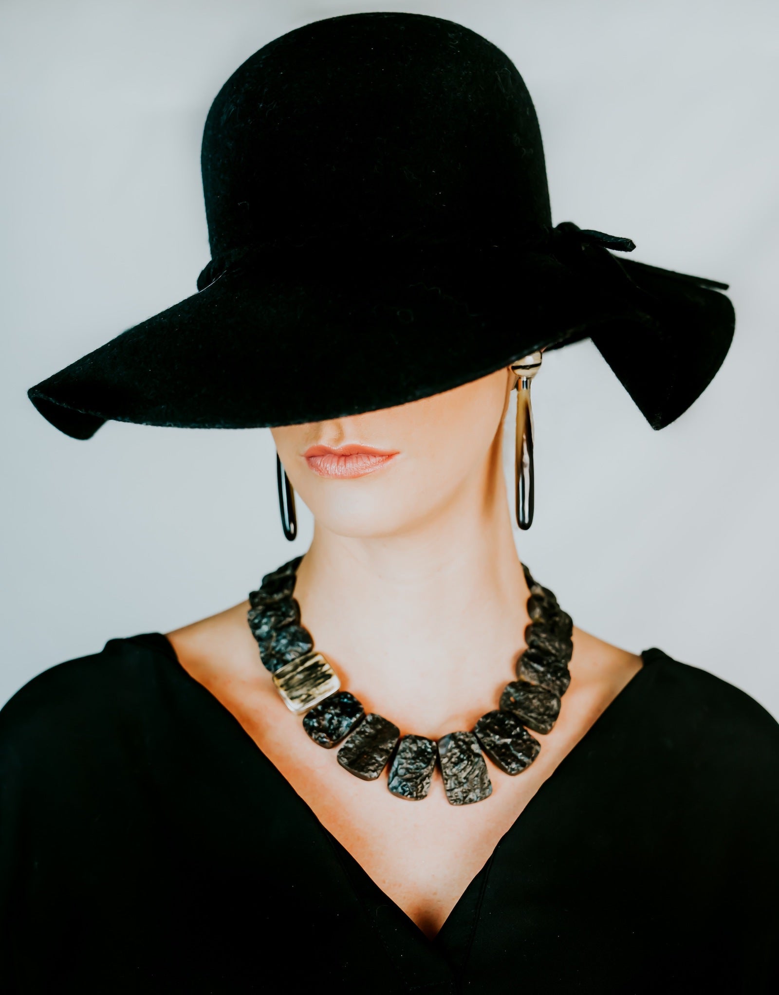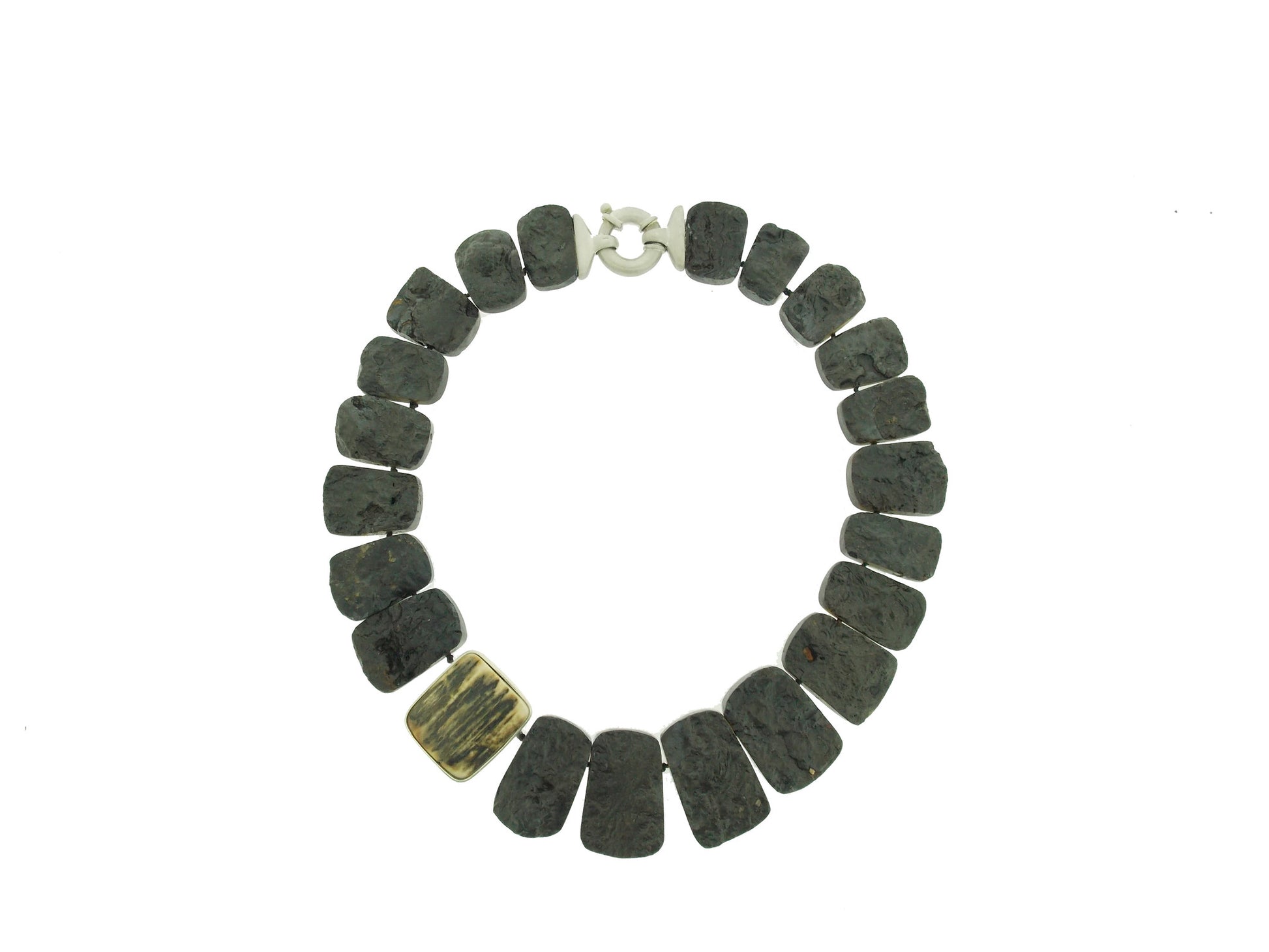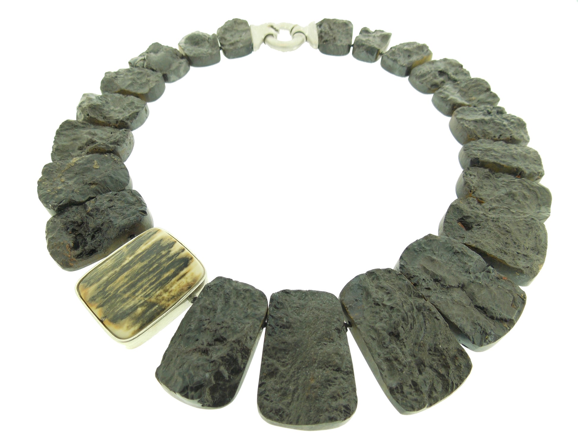 Raw slabs of natural Hematite stones are designed to lay beautifully on the collar bone. Fossilized Woolly Mammoth ivory is hand cut to continue the graceful flow of this one of a kind necklace. Hand forged sterling silver mounting and clasp, hand knotted by the artist. Sorry we can not sell or ship this item to NY or NJ.