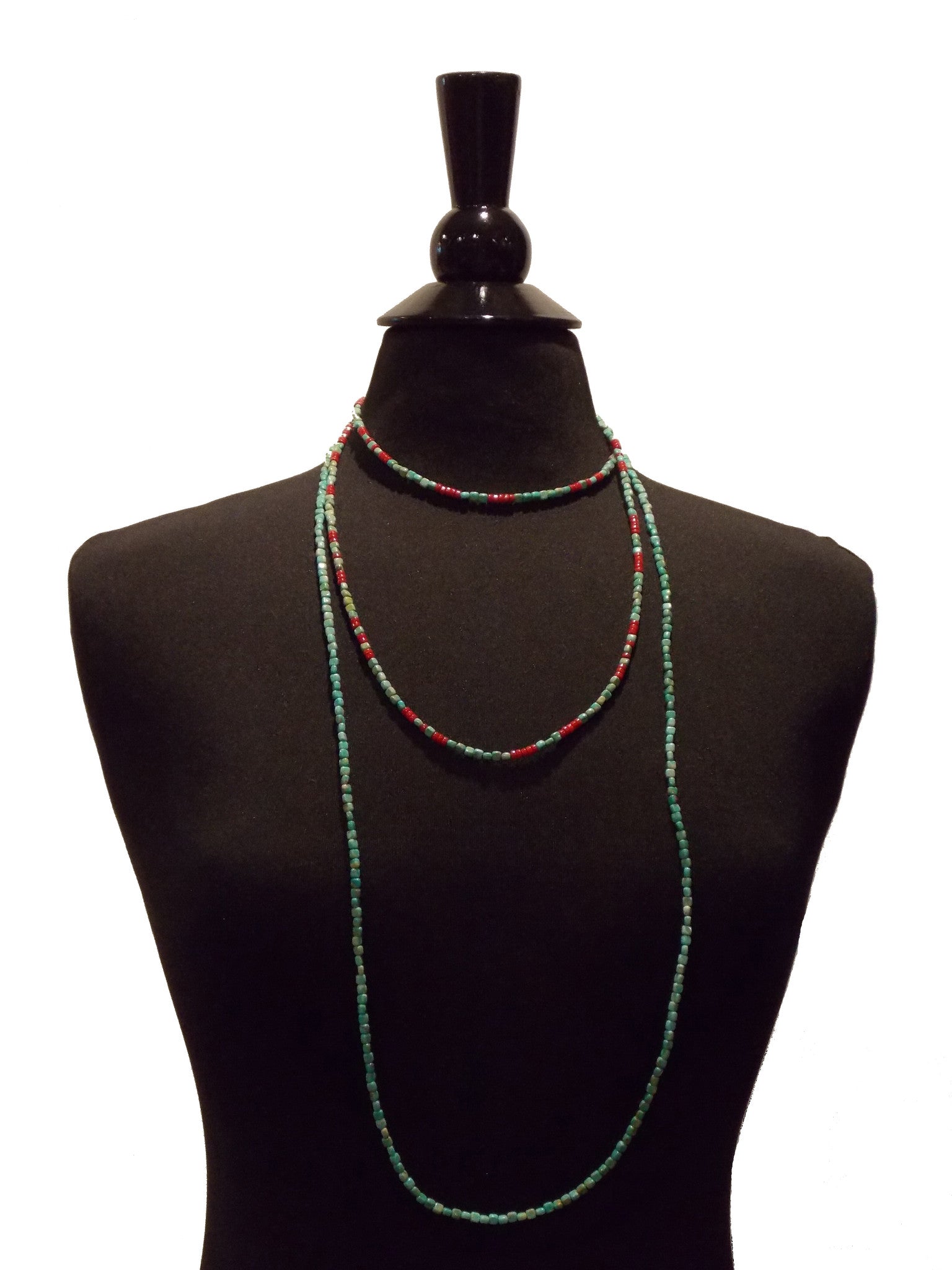 Stunning square cut turquoise is hand-made by the artist into a 39” long necklace. This green hued necklace can be worn in a long single strand or doubled. The necklace is finished with a white gold, locking clasp.