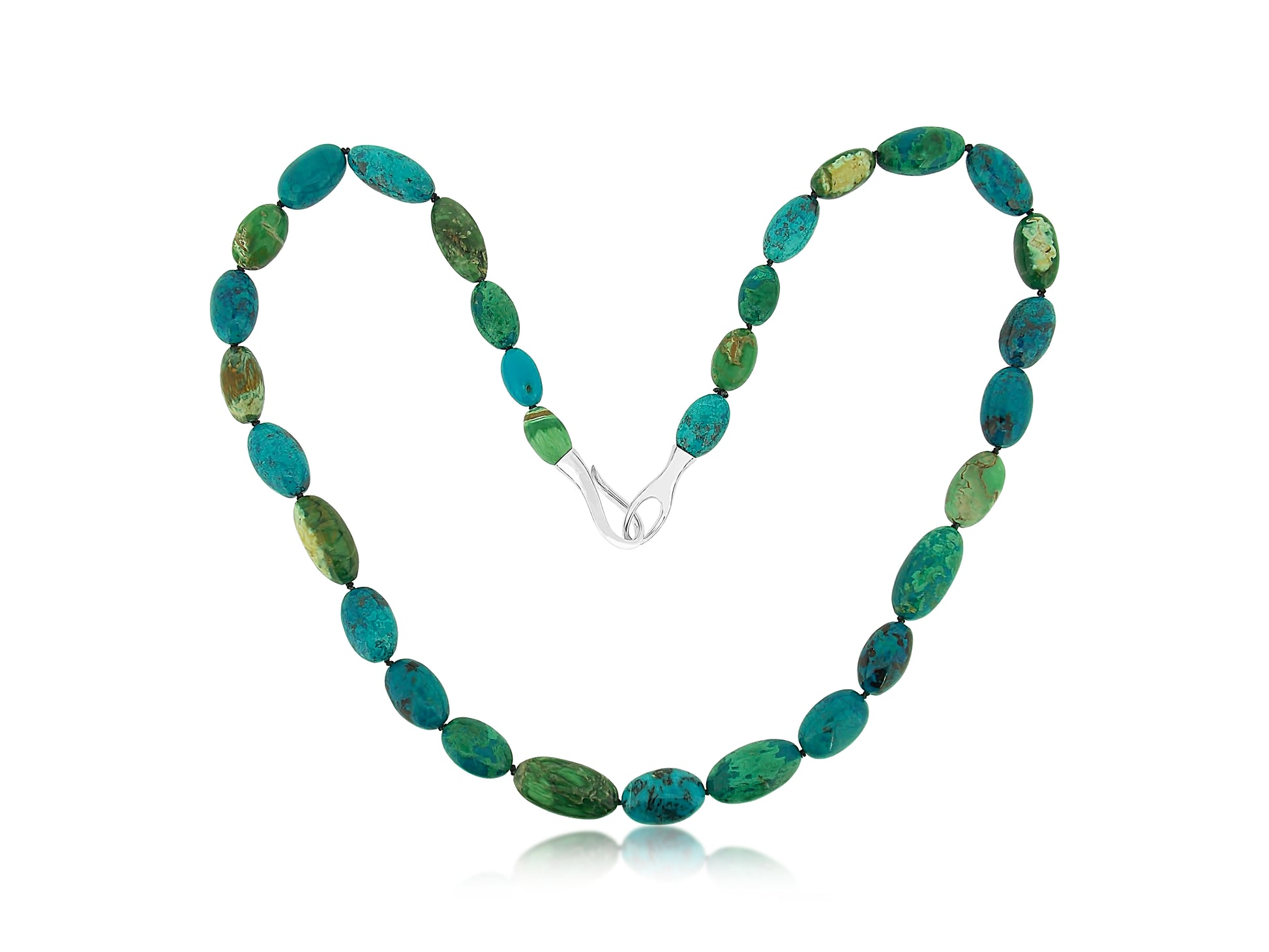 Beautiful mix of Shattuckite, Variscite, Kingman Turquoise, Chrysocolla, and Azurite - stones are from America. All hand cut into fabulous large oval beads. Hand-knotted by artist, Kerri Votaw Kliewer into a 25 inch long necklace