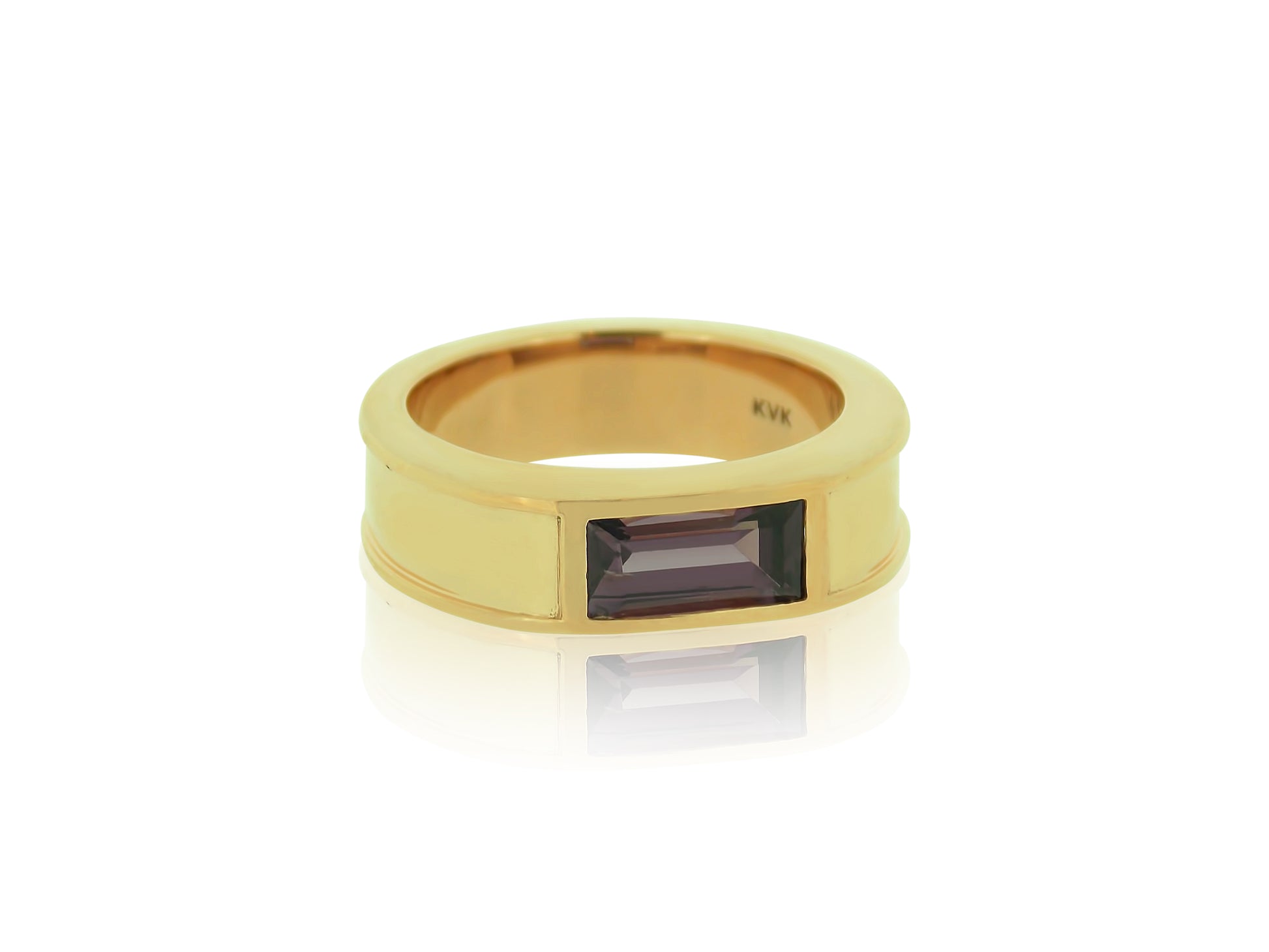 Rare violet spinel stone is set in a beautiful hand made mounting. The stone measures 5mm by 10mm and the spinel's origin is Sri Lanka. It is in a KVK designed, hand made, heavy 14kt rose gold setting. The ring is 6mm wide and is in a size 7. We are happy to size it to fit.