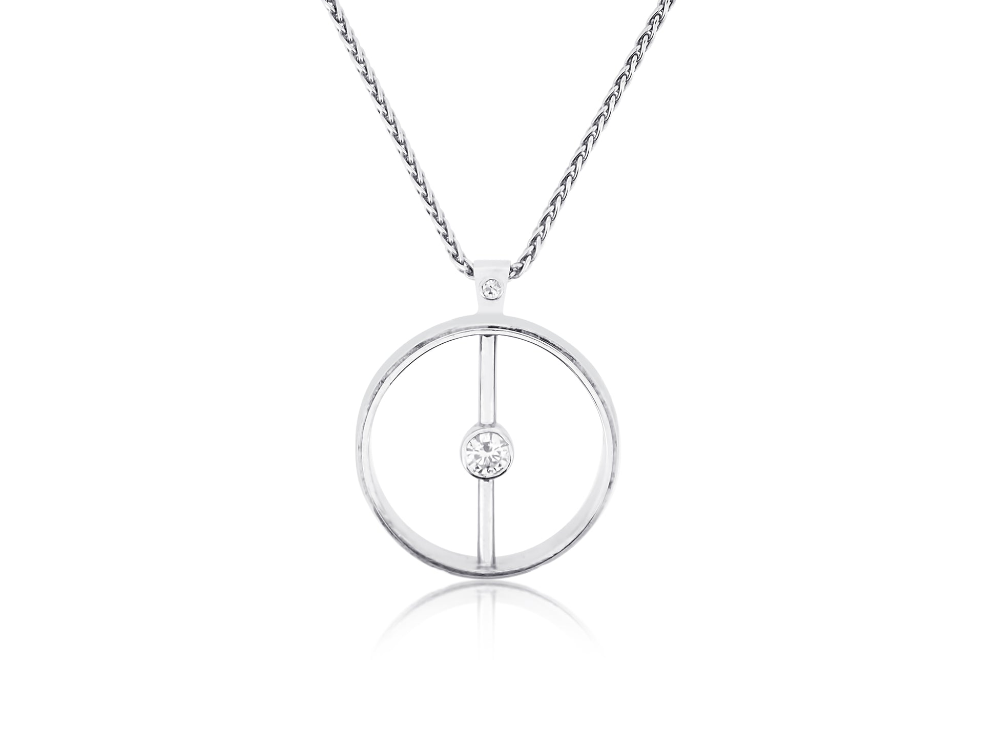 This very special pendant was made from her late husbands wedding band and her engagement diamond. We made his band the outer circle of the pendant and the engagement diamond was bezel set on a narrow gold stick with part of her band as the bail.